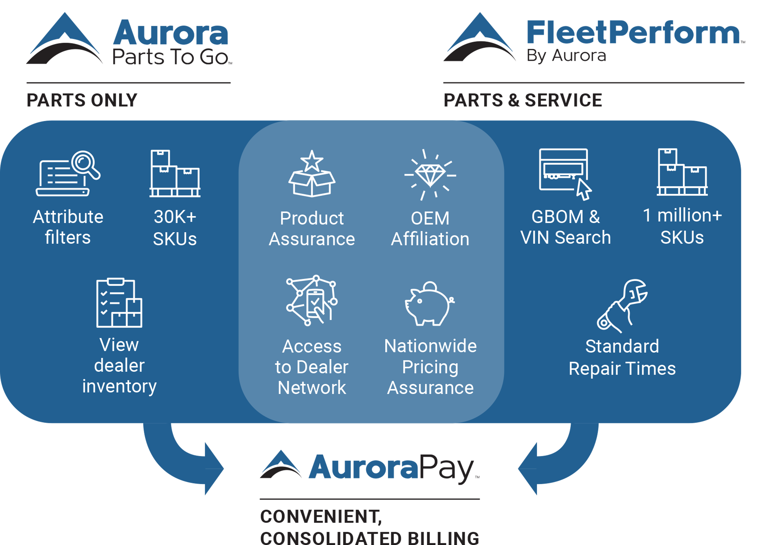 AuroraPay can be leveraged on both FleetPerform & Parts To Go, making purchasing and billing seamless with not-to-exceed pricing.